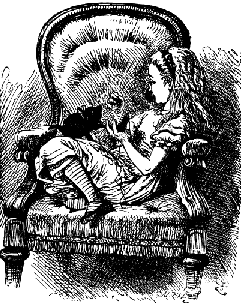 --¿Sabes que estoy muy enojada contigo, gatito? --continuó Alicia cuando pudo acomodarse de nuevo en la butacona--, cuando vi todas las picardías que habías estado haciendo estuve a punto de abrir la ventana y ponerte fuera de patitas en la nieve! ¡Y bien merecido que te lo tenías, desde luego, amoroso picarón! A ver, ¿qué vas a decir ahora para que no te dé? ¡No me interrumpas! --le atajó en seguida Alicia, amenazándole con el dedd--: ¡voy a enumerarte todas tus faltas! Primera: chillaste dos veces mientras Dina te estaba lavando la cara esta mañana; no pretenderás negarlo, so fresco, que bien que te oí! ¿Qué es eso que estás diciendo? (haciendo como que oía lo que el gatito le decía) ¿que si te metió la pata en un ojo? Bueno, pues eso también fue por tu culpa, por no cerrar bien el ojo... si no te hubieses empeñado en tenerlo abierto no te habría pasado nada, ¡ea! ¡Y basta ya de excusas: escúchame bien! Segunda falta: cuando le puse a Copito de nieve su platito de leche, fuiste y la agarraste por la cola para que no pudiera bebérsela. ¿Como?, ¿que tenías mucha sed?, bueno, ¿y acaso ella no? ¡Y ahora va la tercera: desenrollaste todo un ovillo de lana cuando no estaba mirando!